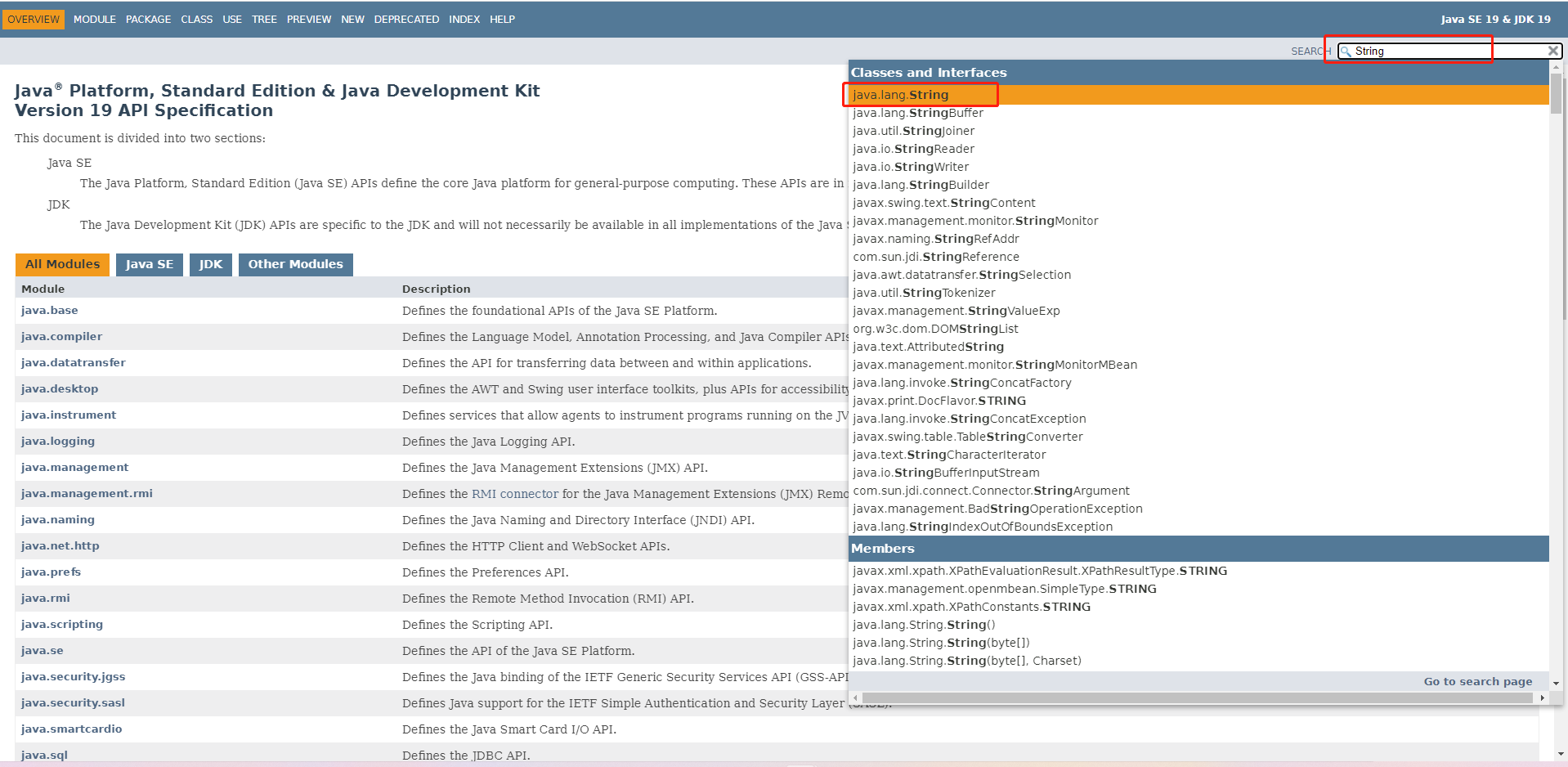 ② 搜索框中输入关键字String 找到java.lang包下的String