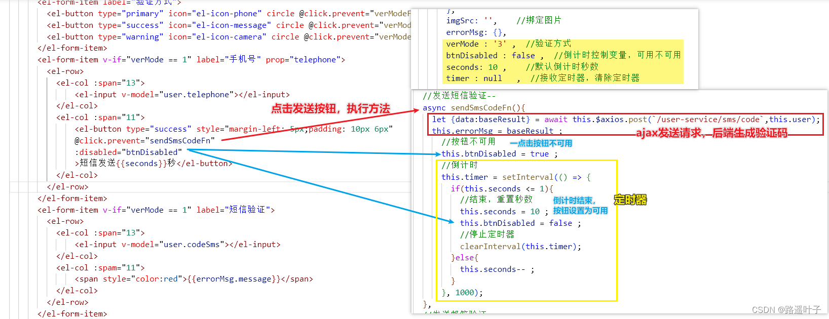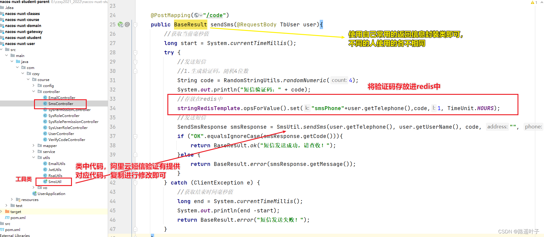 public class SmsController {@Resourceprivate StringRedisTemplate stringRedisTemplate ;@PostMapping("/code")public BaseResult sendSms(@RequestBody TbUser user){//获取当前毫秒值long start = System.currentTimeMillis();try {//发送短信//1.生成验证码,随机4位数String code = RandomStringUtils.randomNumeric(4);System.out.println("短信验证码:" + code);//存放在redis中stringRedisTemplate.opsForValue().set("smsPhone"+user.getTelephone(),code,1, TimeUnit.HOURS);//发送短信SendSmsResponse smsResponse = SmsUtil.sendSms(user.getTelephone(), user.getUserName(), code, "", "");if ("OK".equalsIgnoreCase(smsResponse.getCode())){return BaseResult.ok("短信发送成功,请查收!");}else {return BaseResult.error(smsResponse.getMessage());}} catch (ClientException e) {//获取结束时间毫秒值long end = System.currentTimeMillis();System.out.println(end -start);return BaseResult.error("短信发送失败!");}}}