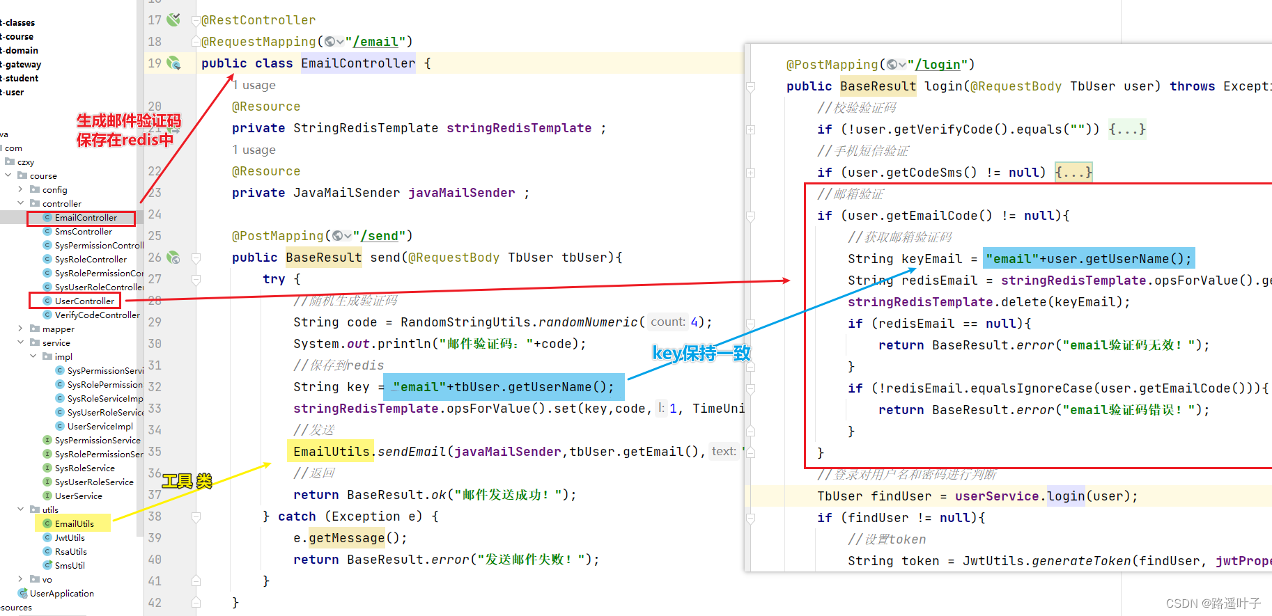 public class UserController {@Resourceprivate UserService userService ;@Resourceprivate JwtProperties jwtProperties ;@Resourceprivate StringRedisTemplate stringRedisTemplate ;@PostMapping("/login")public BaseResult login(@RequestBody TbUser user) throws Exception {//邮箱验证if (user.getEmailCode() != null){//获取邮箱验证码String keyEmail = "email"+user.getUserName();String redisEmail = stringRedisTemplate.opsForValue().get(keyEmail);stringRedisTemplate.delete(keyEmail);if (redisEmail == null){return BaseResult.error("email验证码无效!");}if (!redisEmail.equalsIgnoreCase(user.getEmailCode())){return BaseResult.error("email验证码错误!");}}//登录对用户名和密码进行判断//调用userService接口中的方法login进行实现类编写,判断用户名和密码是否正确TbUser findUser = userService.login(user);if (findUser != null){//设置tokenString token = JwtUtils.generateToken(findUser, jwtProperties.getExpire(), jwtProperties.getPrivateKey());return BaseResult.ok("登录成功,欢迎"+findUser.getUserName(),findUser).append("token",token);}else {return BaseResult.error("用户名或密码不正确!");}}