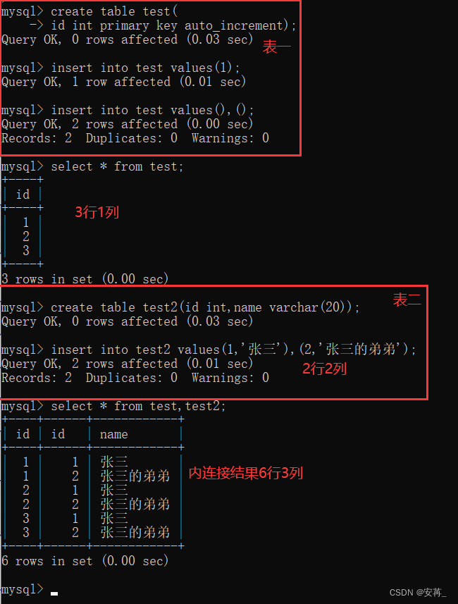 效果:生成表的行数是被连接表行数的乘积,列数是被连接表列数的和。